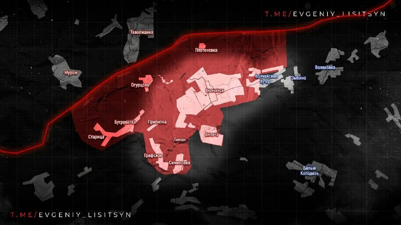Revue du front, cartes publiées par les canaux du reporter de guerre Evgueni Lisitsyne et Дневник Десантника, situation du front sur la ligne de , secteur charnière entre celui Ouest et Est, en avant de Voltchansk.