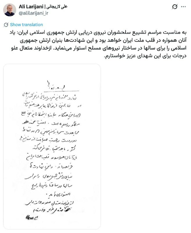 Le secrétaire du Conseil de sécurité nationale iranien, Ali Larijani, annoncé comme étant mort par l'armée israélienne, a publié un message à l'occasion de la cérémonie d'adieu aux marins tués de la frégate IRIS Dena.