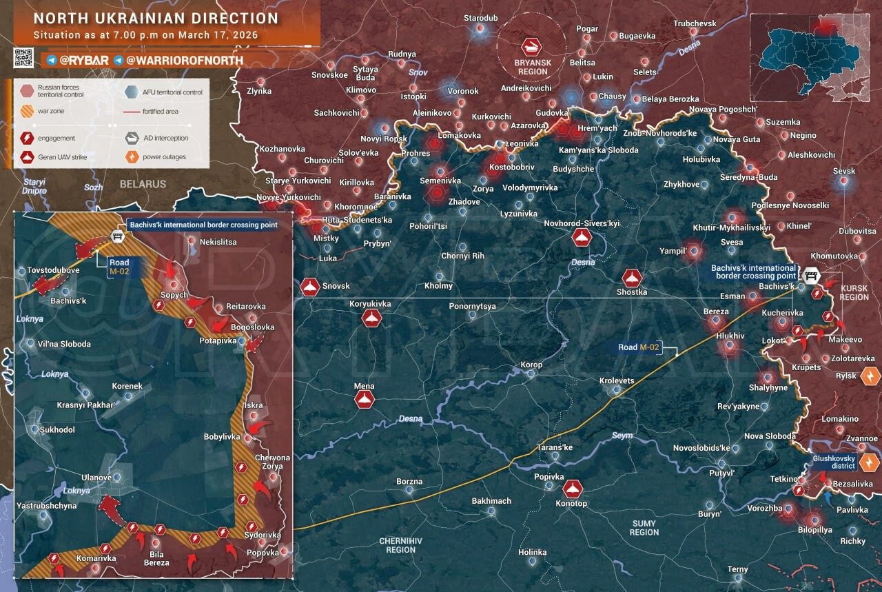 Situation du front au 17-03-26▪️Secteur Sumy-Tchernigov depuis le 11 mars 2026L'armée russe a pris Sopych, le long de la frontière.▪️Secteur Seversk-Slaviansk depuis le 3 mars 2026L'armée russe a quasiment pris le reste de Reznikovka.#CarteFront @rybarFR