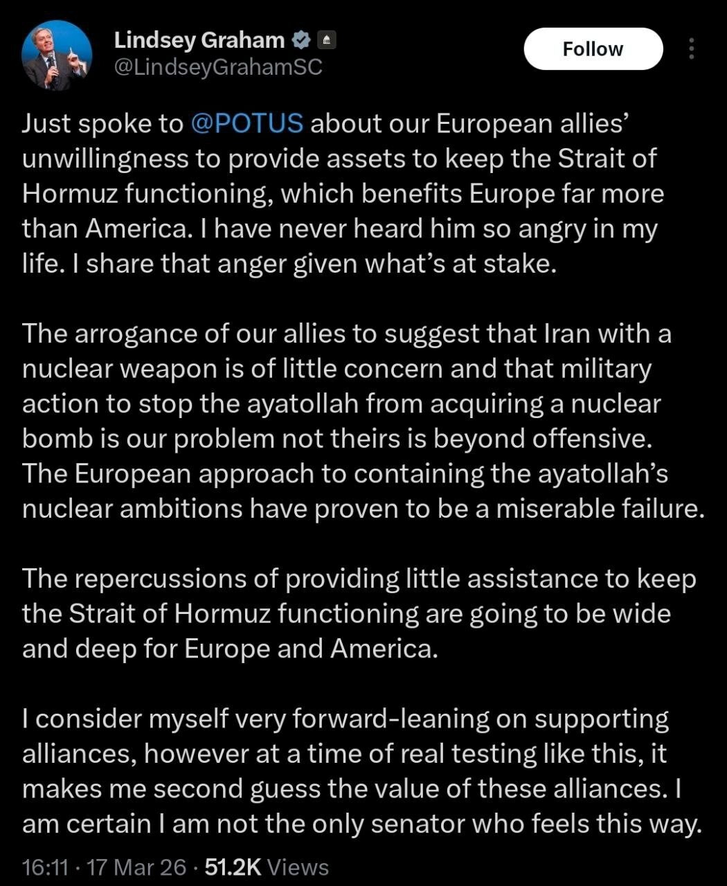 Lindsey "Gay Gay pout la Guerre" Graham a parlé avec #Trump et a déclaré qu'il est très en colère que les alliés européens ne veuillent pas aider les États-Unis avec l'Iran, même si les États-Unis n'ont pas besoin d'aide de toute façon.