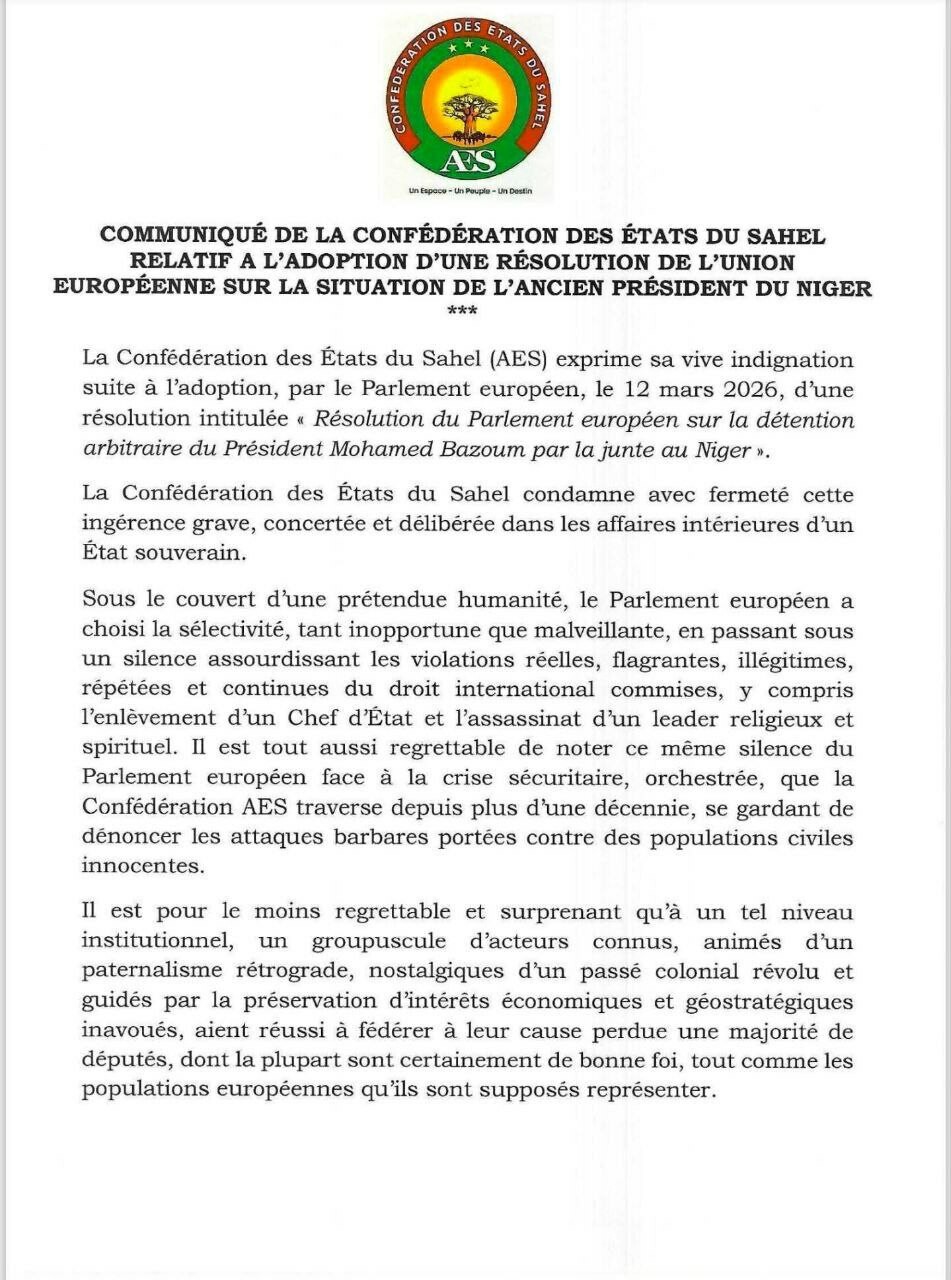 Réaction de l’AES à la résolution européenne sur Mohamed Bazoum:La Confédération des États du Sahel exprime sa vive indignation après l’adoption, le 12/03/26, par le Parlement européen, d’une résolution dénonçant la détention de l’ancien président