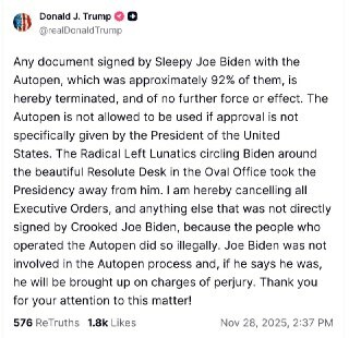 a déclaré que tous les documents signés par Joe avec une machine à signer sont nuls et non avenus. Cela représente environ 92 % des documents, a souligné le président américain. RT en français • Osez questionner !