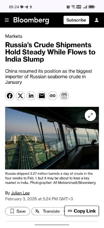 POUR LES RUSSOPHOBES QUI NE COMPRENNENT PAS QUE LE MONDE NE PEUT PAS SE PASSER DE L'ENERGIE RUSSE SANS PROVOQUER UNE CRISE MONDIALE L'exportation de pétrole russe reste stable, malgré la pression extérieure, la Chine restant le plus grand acheteu