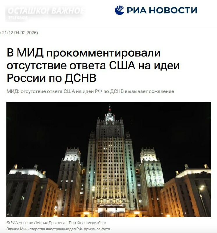 Les États-Unis n'ont pas répondu sur le traité START : la Russie considère le traité comme effectivement résilié. Les États-Unis n'ont pas donné de réponse formelle à la proposition russe de continuer à respecter les limites du Traité sur la rédu