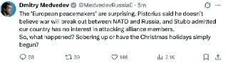 Dmitri Medvedev sur l'éclairage soudain des faucons européens Les « pacificateurs européens » surprennent. Pistorius a déclaré qu’il ne croyait pas à l’éclatement d’une guerre entre l’OTAN et la Russie, et a reconnu que notre pays n’avait aucun intérêt à attaquer les membres de l’alliance. Alors, qu’est-ce qui s’est passé ? Ils ont-ils repris leurs esprits — ou les vacances de Noël ont-elles simplement commencé ? »