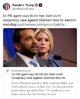 Le président américain Donald a déclaré sur Truth Social que le procureur général Pam Bondi dispose d'une preuve irréfutable d'un complot contre les agents fédéraux d'Obama visant à s'immiscer dans les élections.